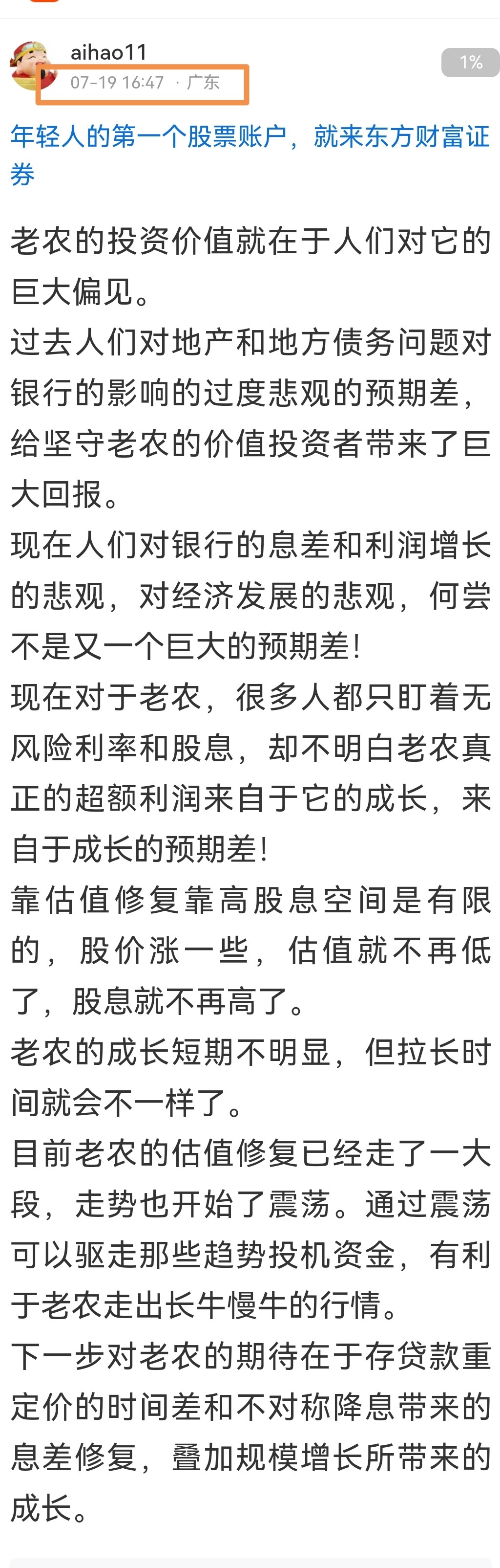 目前老农的估值修复已经走了一大段,走势也开始了震荡。通过震荡可以驱走那些趋势投机资金,有利于老农走出长牛慢牛的行情。