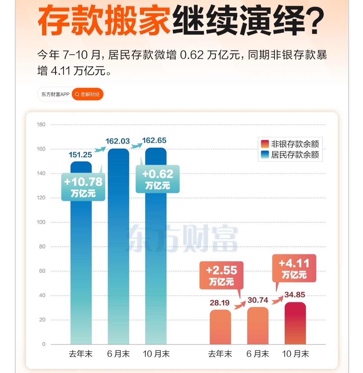央行最新数据炸翻金融圈!2025年下半年以来,非银行业金融机构存款暴增4.11万亿元,仅10月单月就狂揽1.85万亿元,同比多增7700亿元;而同期居民存款仅微增0.62万亿元,10月更是净减少1.34万亿元——一增一减间,一场规模空前的"存款大迁徙"正在上演,万亿资金正加速逃离银行存款,涌向资本市场!
