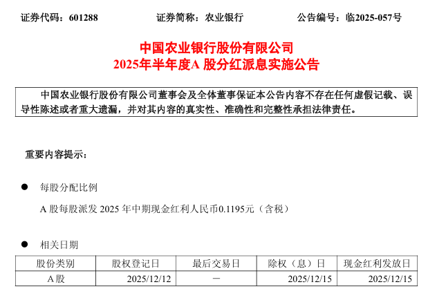 农业银行(601288)12月8日晚间发布2025年半年度A股分红派息实施公告称,公司本次利润分配以3499.83亿股普通股为基数,每股派发2025年中期现金红利人民币0.1195元(含税),共计派发现金红利约人民币418.23亿元(含税);其中,A股普通股股份数为3192.44亿股,本次派发A股现金红利共约人民币381.50亿元(含税)。