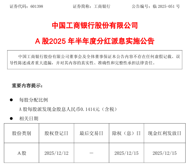 同日,工商银行(601398)发布A股2025年半年度分红派息实施公告称,公司本次利润分配以截至分红派息股权登记日2025年12月12 日的3564.06亿股普通股为基数,每股派发现金股息人民币0.1414元(含税),本次派发现金股息共计约人民币503.96亿元。其中,A股普通股股份数为2696.12亿股,本次派发A股现金股息共计约人民币381.23亿元。