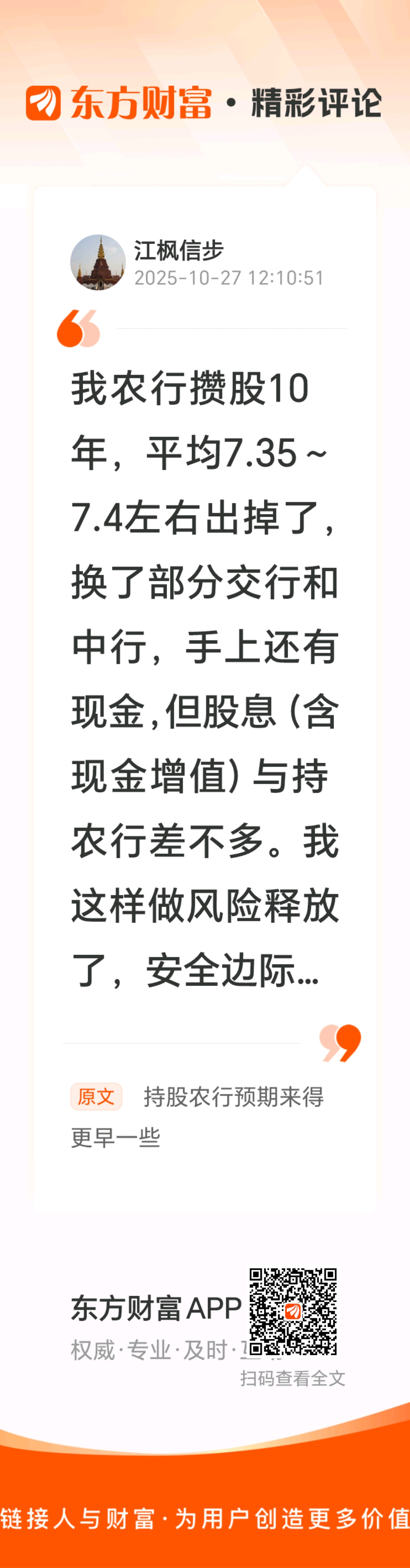 //@江枫信步 :我农行攒股10年,平均7.35~7.4左右出掉了,换了部分交行和中行,手上还有现金,但股息(含现金增值)与持农行差不多。我这样做风险释放了,安全边际有了,手上还有570W现金也机动了。每年收的红利也是差不多。因为我投资的宗旨是以收红利为目的。