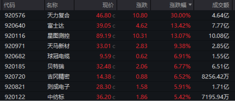 个股方面,天力复合30%涨停,富士达、星图测控涨超13%,天马新材涨超9%。