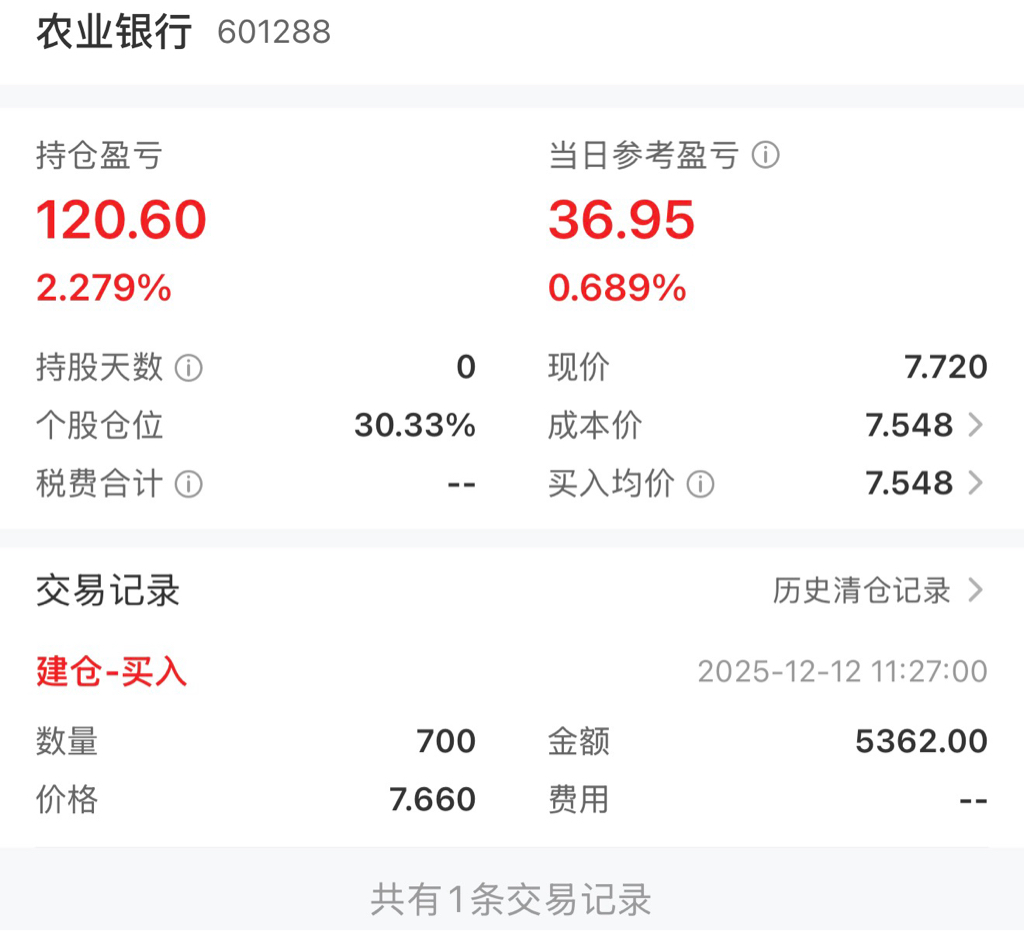 $农业银行(SH601288)$ 我这个下周一开盘,本金会不会变回7.66