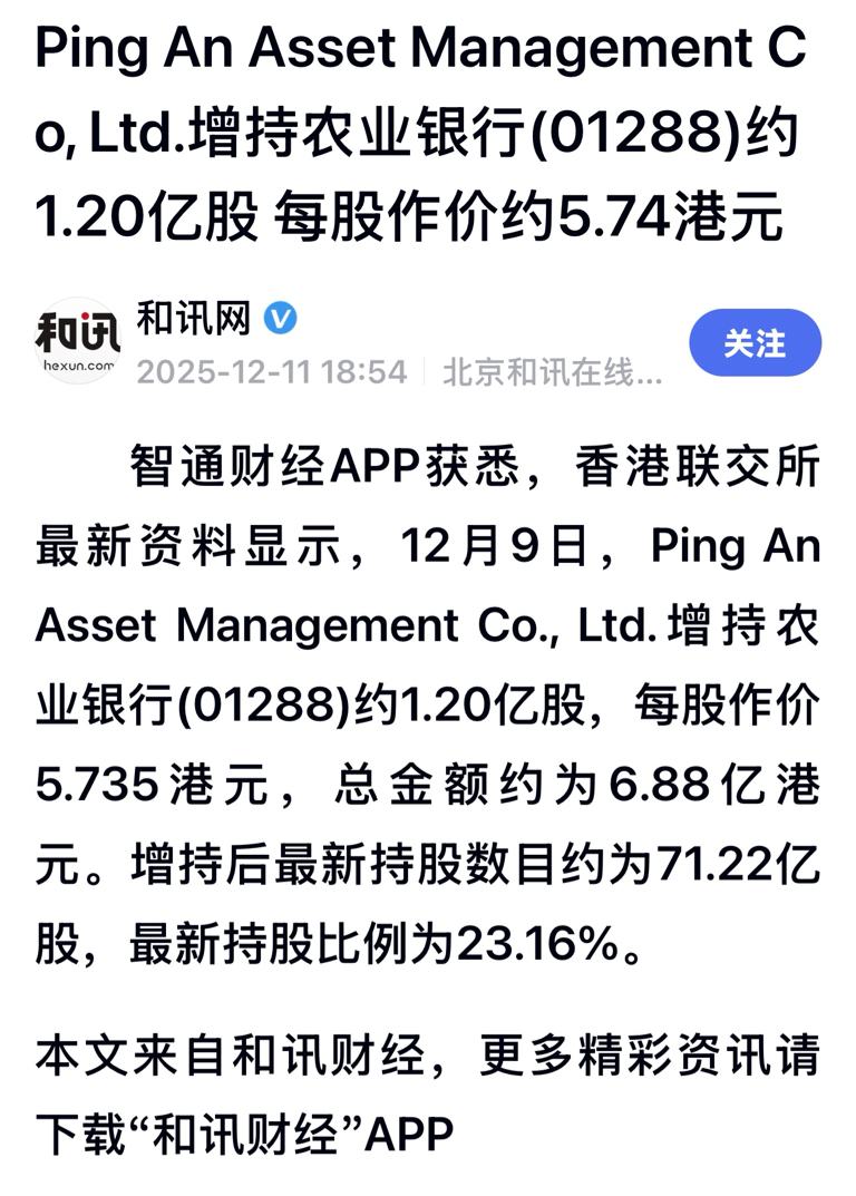 $农业银行(SH601288)$ 平安资管增持农业银行1.20亿股