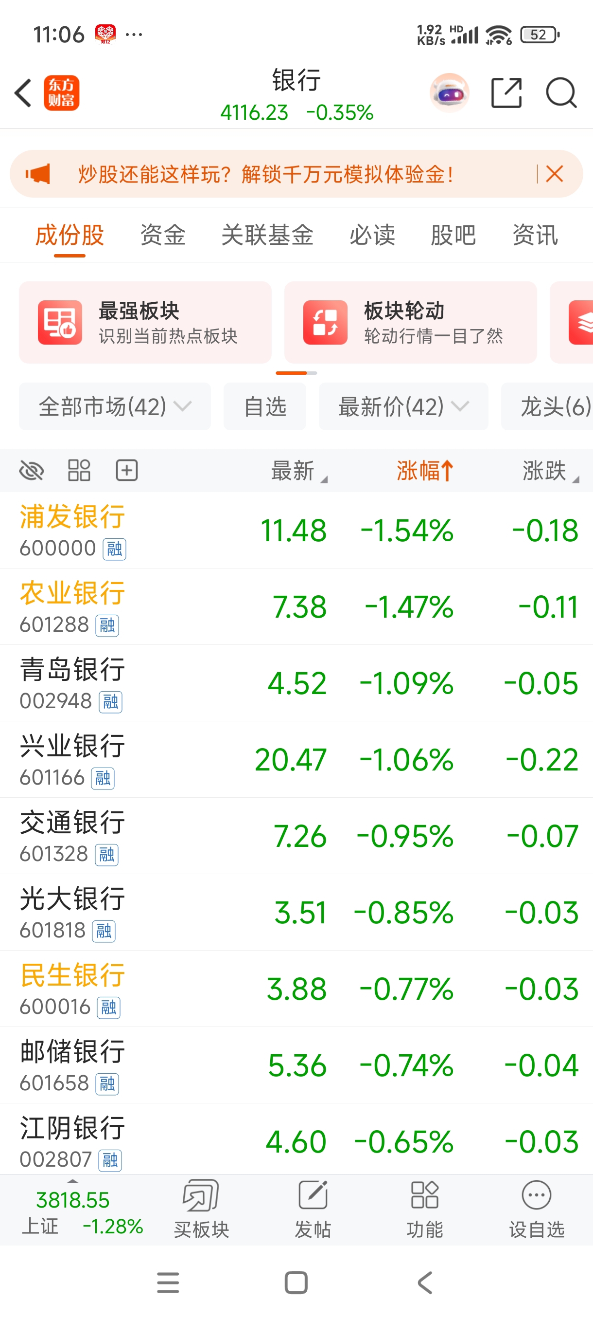 $农业银行(SH601288)$ 还好今天不是倒数第一了