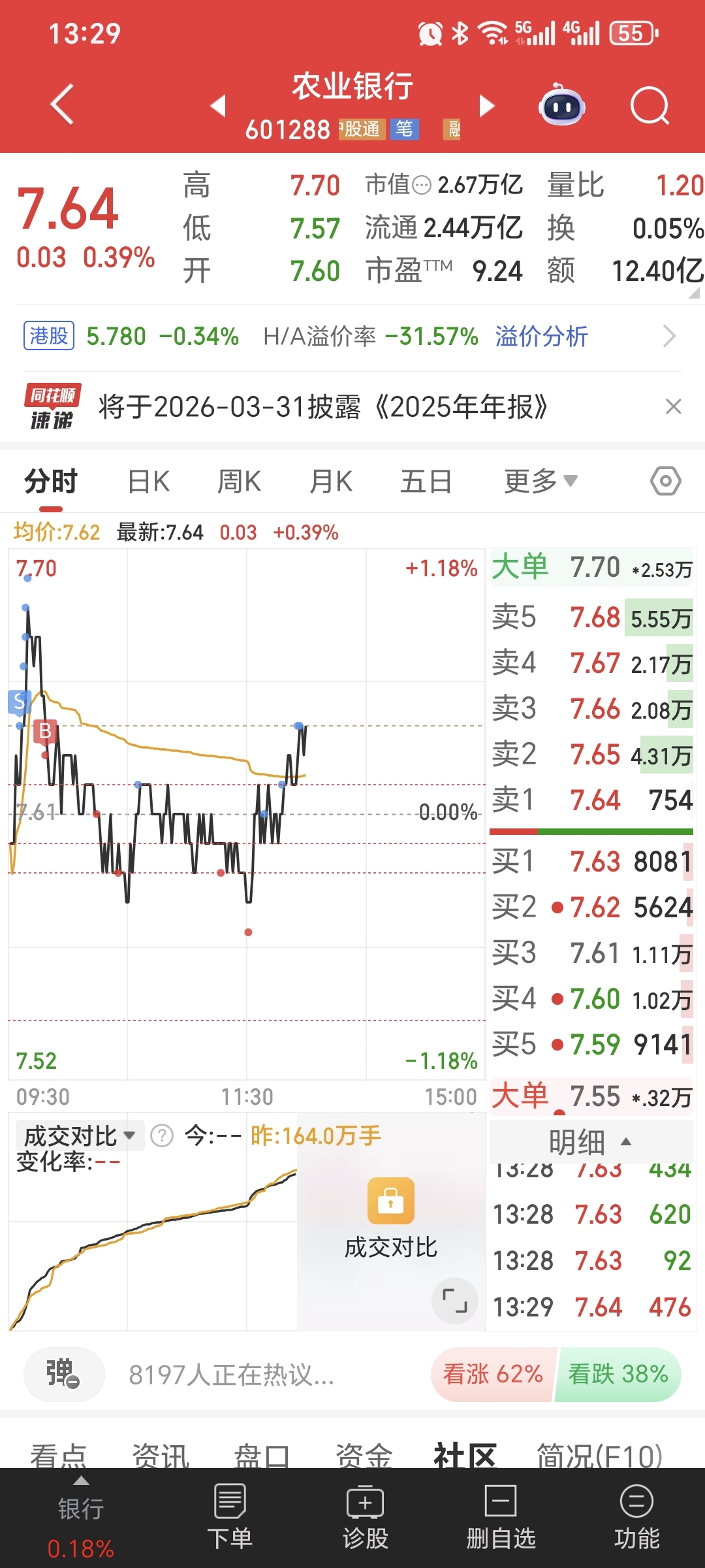 $农业银行(SH601288)$ 跌下来吧,不然显得我很多余