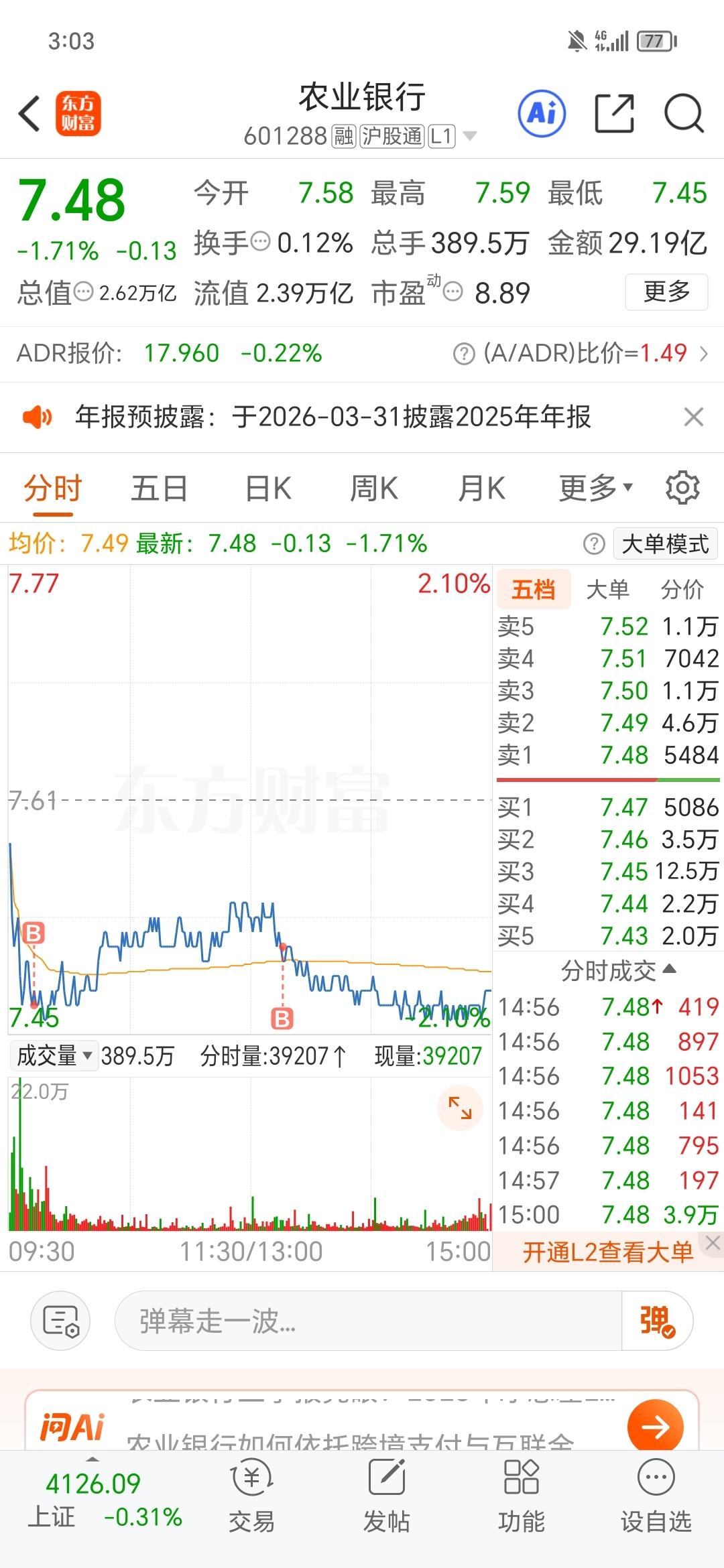 $农业银行(SH601288)$ 今天加仓了,上午还高兴来着,下午看见大盘跳水又加仓了,结果他不护盘了