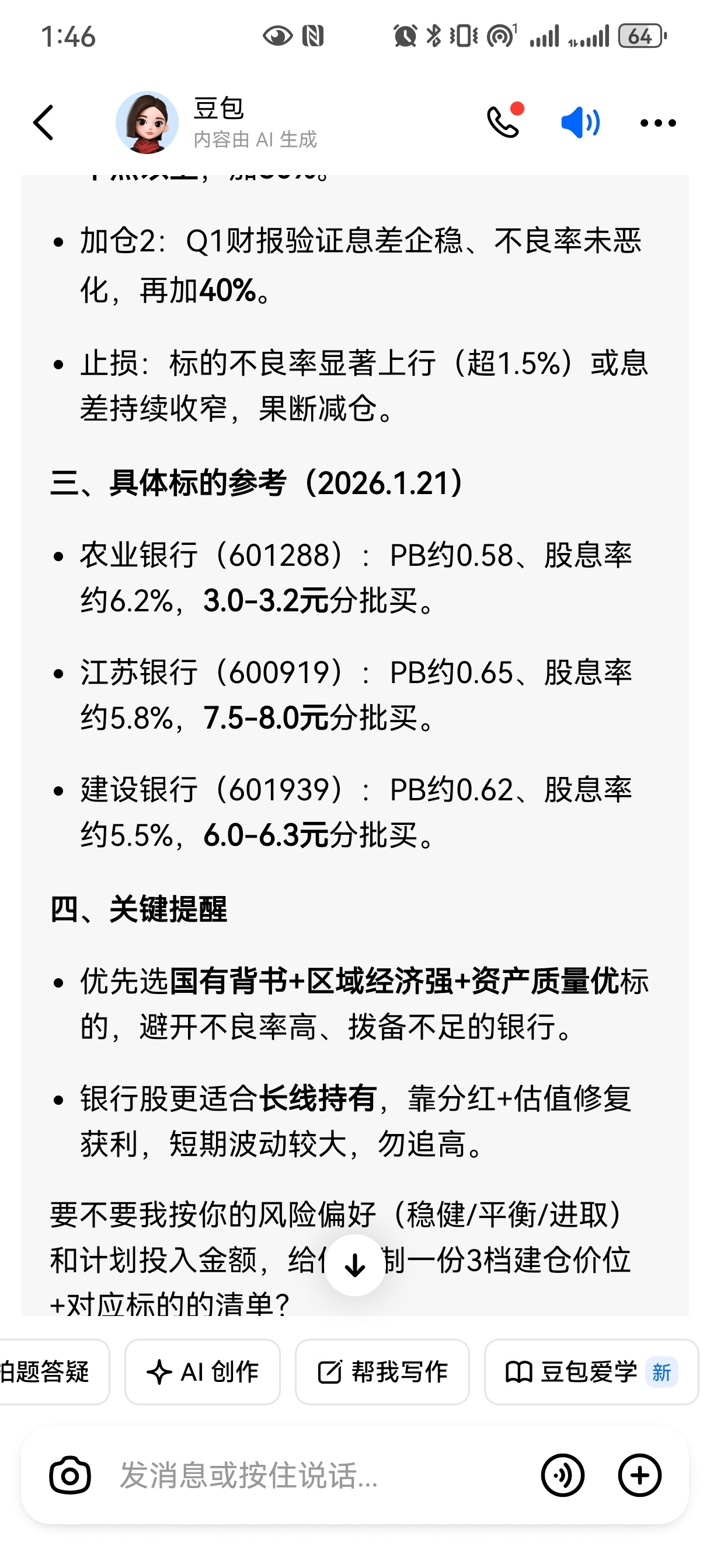 $农业银行(SH601288)$ 豆包建议3块到3.2块入仓