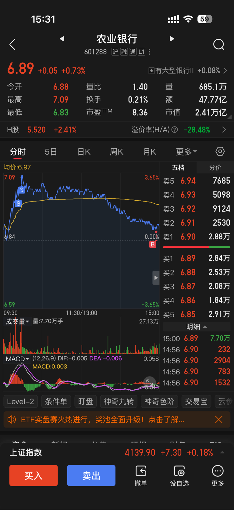$农业银行(SH601288)$ 早上10点前卖了100多万,尾盘买回100股