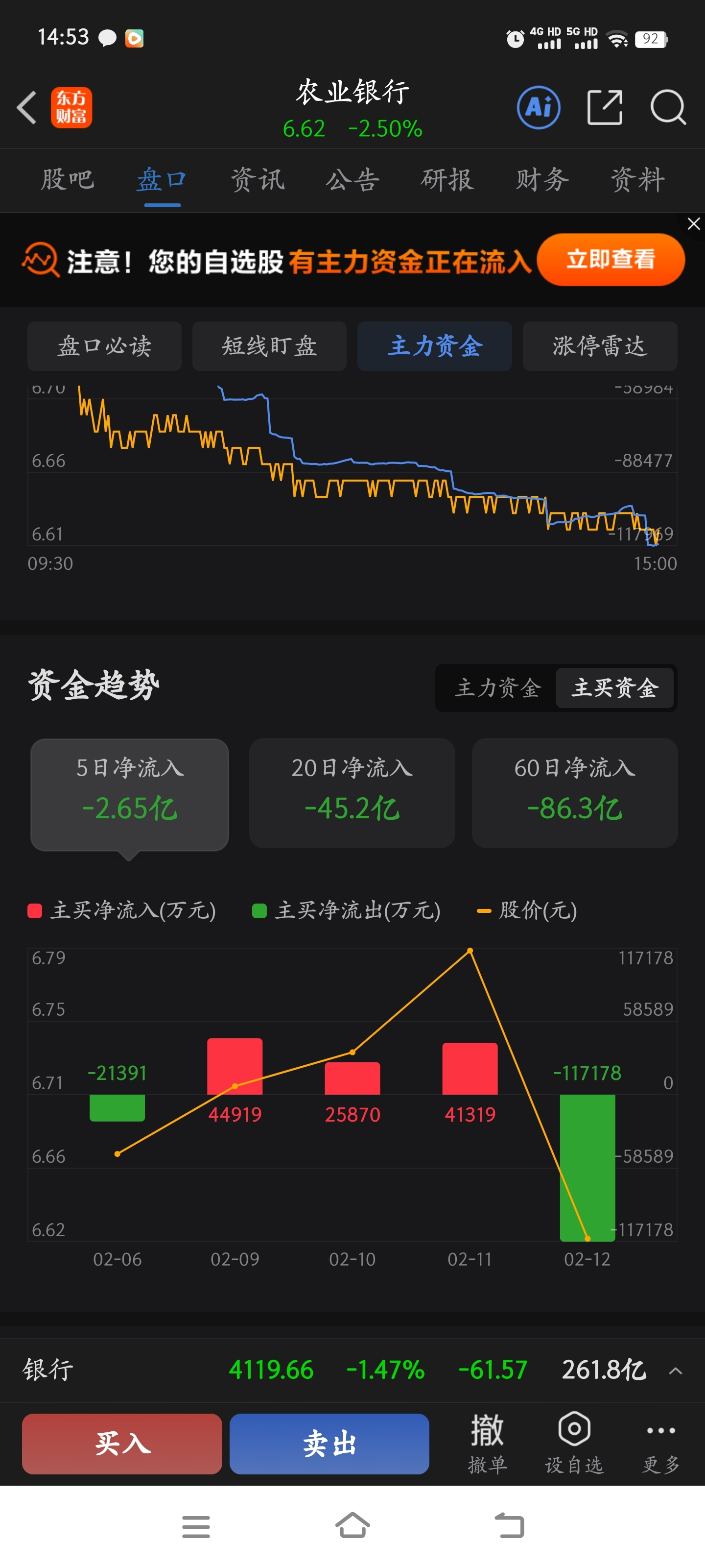 $农业银行(SH601288)$ 废柴,三天进来的资金一天跑完