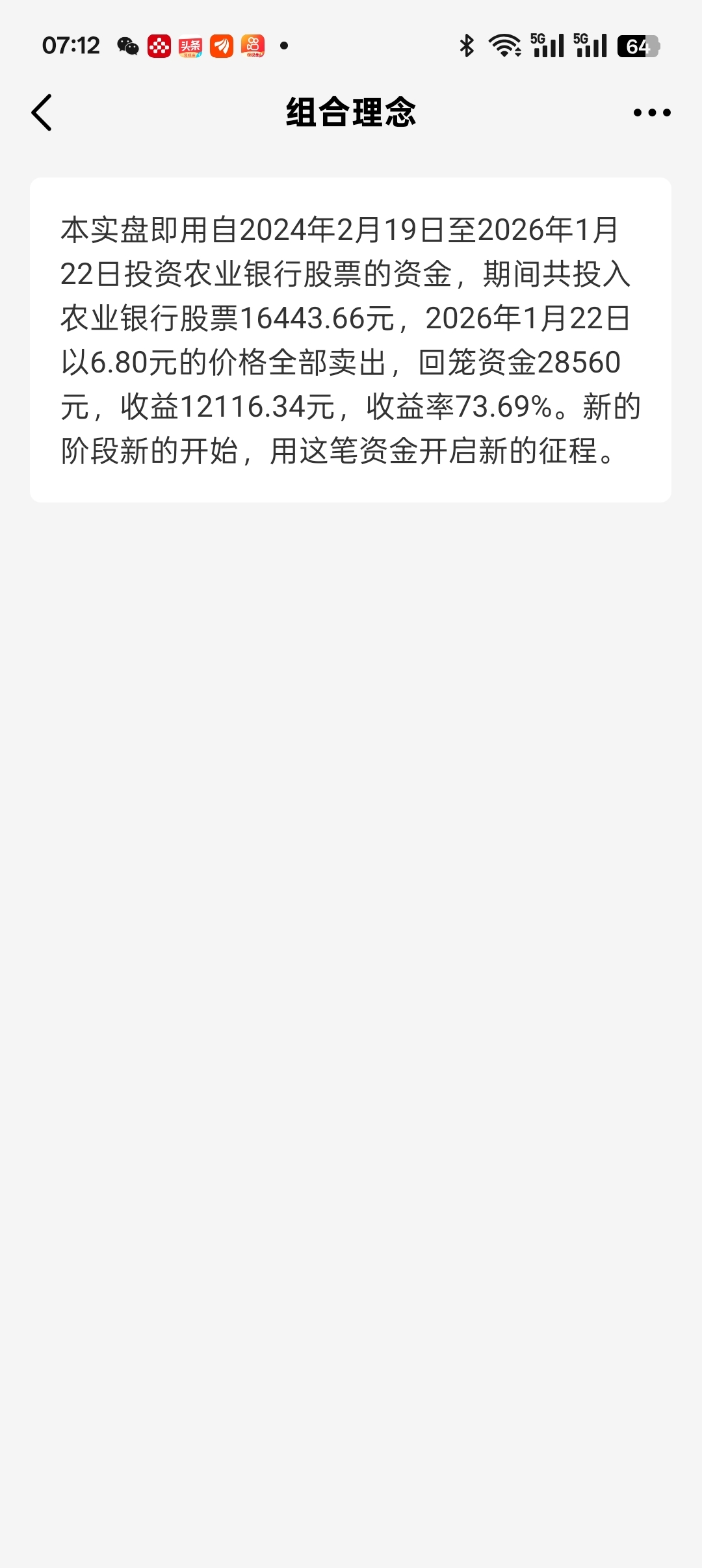 持仓农行股票接近两年,收益70多个点,已于20天前把这个股票全部清仓,转换新的赛