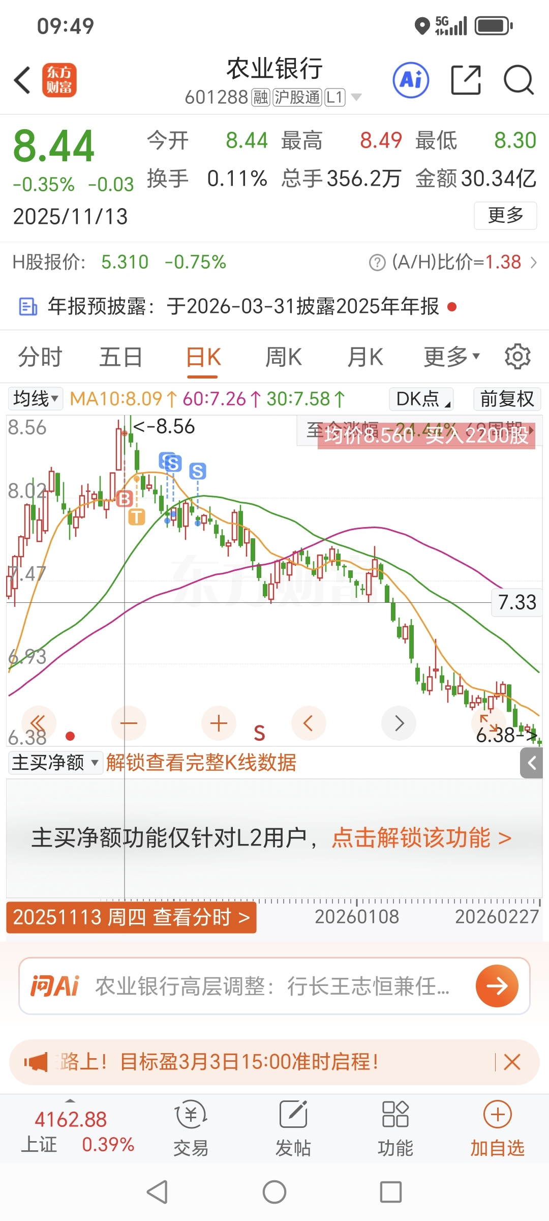 $农业银行(SH601288)$ 买在最高点8.56,估计今年是回不去了