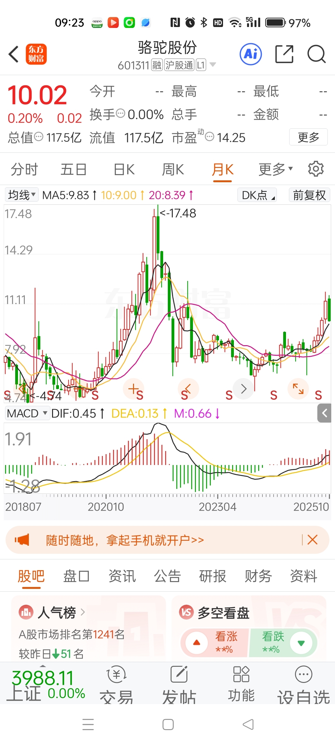 $骆驼股份(SH601311)$ 别老是像只青蛙坐在井里,目光看远点别只盯几天十来天!把k线图放长点看还不明白的销户去吧,底部在不断抬高!你别老跟我说这是要出货?主力忙活了半年就为了十块出头就出货?用你的驴脑袋想大资金建仓也不会这么低位出吧!