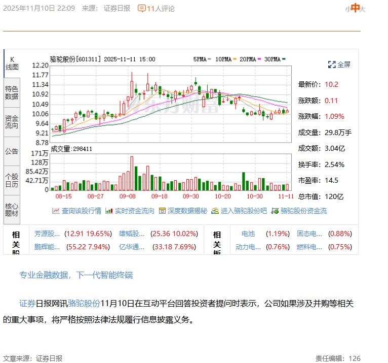 骆驼股份这则重大并购重组消息不会是空穴来风!大家各自斟酌!我持有部分仓位,成本10元,我等待!