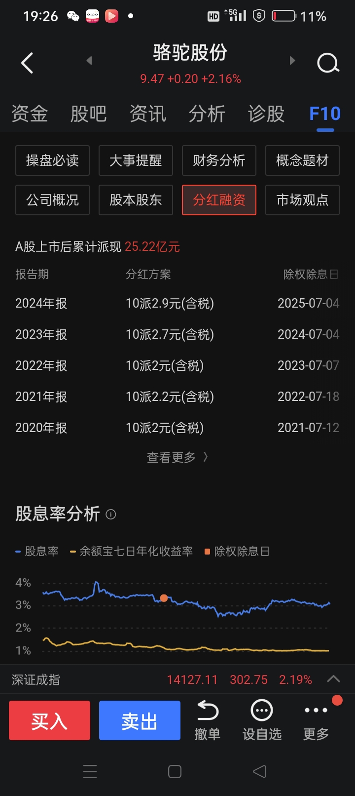 $骆驼股份(SH601311)$ 特意查了一下,骆驼牌香烟上市以来历年分红总额大于融资,这烟草公司不差钱,年化股息率有三个点,放眼全中国还没有哪家银行三五年定期存款能超过这个收益,连长期国债的年化利率都达不到三个点,且银行利率仍呈下行态势,大可中长期放心持有,如遇大幅下跌还可分批加仓摊低成本。