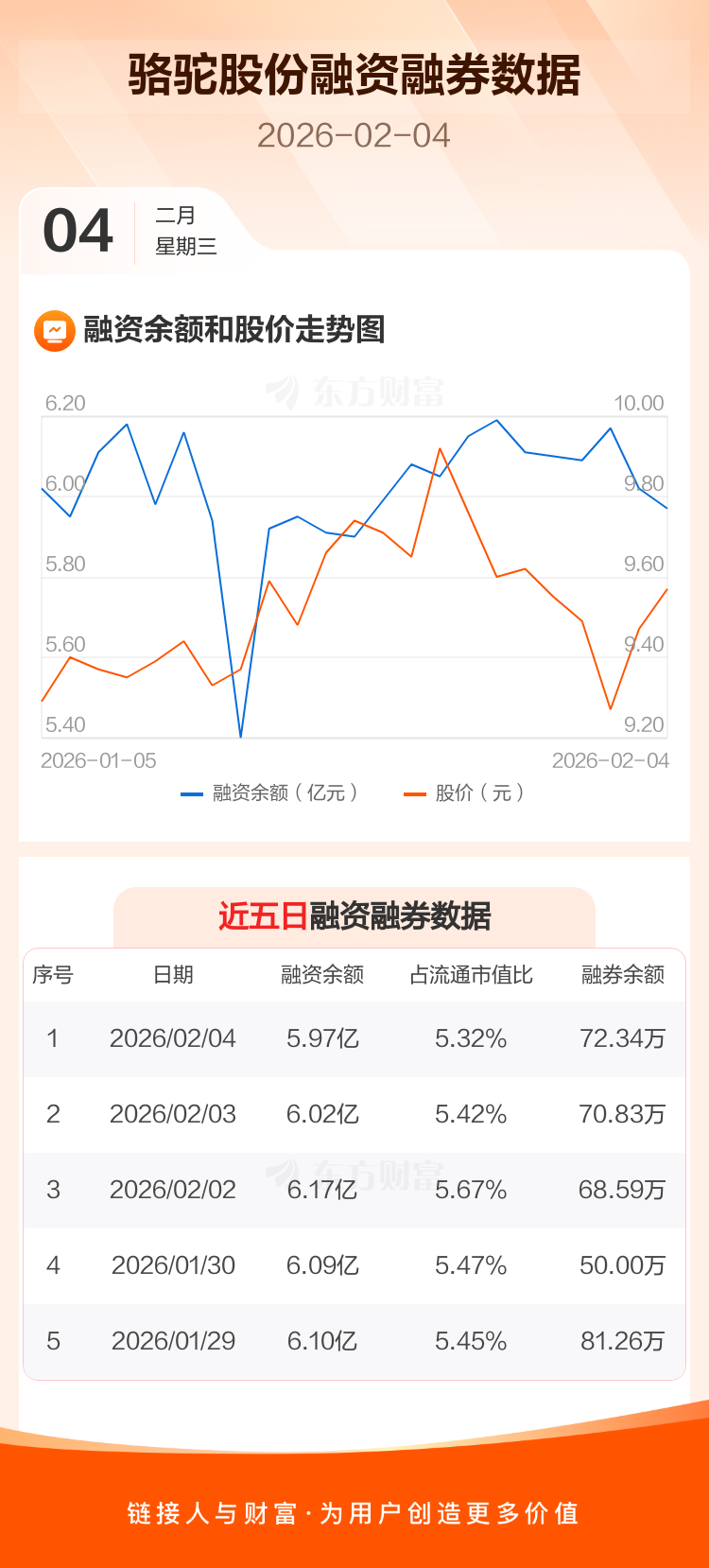 交易所最新数据显示,骆驼股份于2026年2月4日获融资买入1106.29万元,融资偿还1617.25万元,当日融资净偿还510.95万元。目前,该股融资余额5.97亿,占流通市值比例为5.32%。