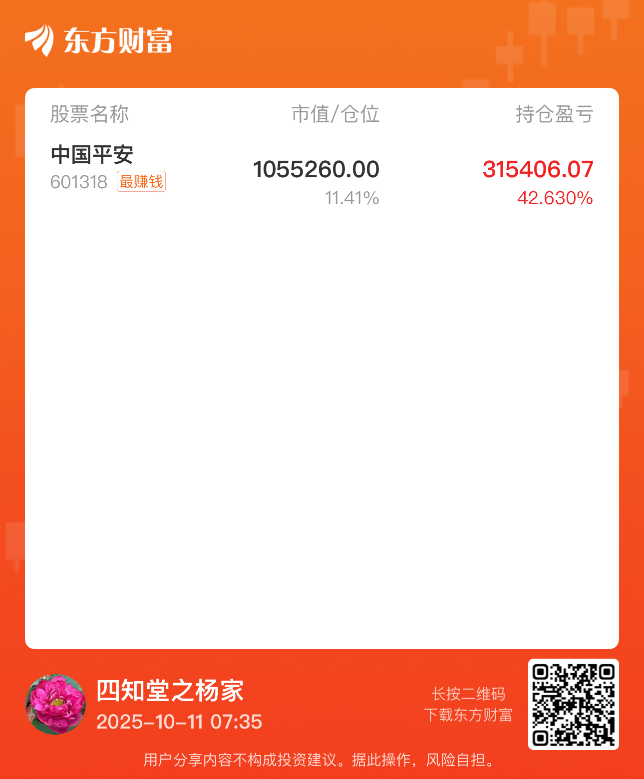 $中国平安(SH601318)$ 价值投资和长线投资在大A市场似乎是个伪命题?不知不觉中在七八月净乎清仓后,于九月再次将仓位回补回百万。老登总被小登们嘲笑,投机炒作击鼓传花的所谓高科技,自己是看不懂其中投资的价值所在,奉行不懂不做的原则,还是守着自己的老登股,时不时做做T,积少成多就是件快乐的事儿。#炒股日记# #投资随笔# #实盘记录#