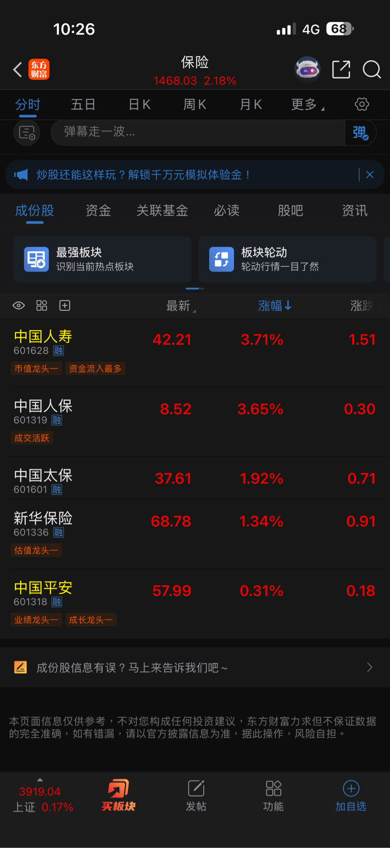 $中国平安(SH601318)$ “龙头”呵呵,真的很讽刺,保险涨上去了,你1%都没有的龙头?哈哈,平安现在的水平怎么这样了,还是这就是平安的水平
