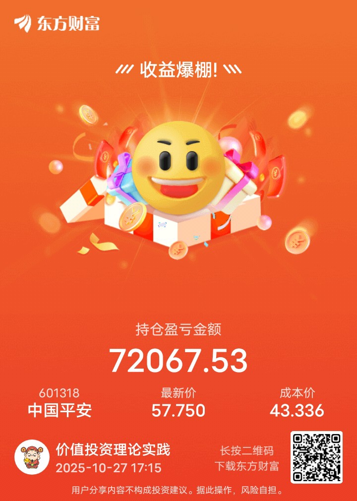 $中国平安(SH601318)$ 我就知道平安让我赚到了我认知以内的钱,其他的都扯淡,也赚不了,我比较喜欢用事实说话。不是,看笑话也好,看热闹也罢,反正就是谁赚钱谁高兴。