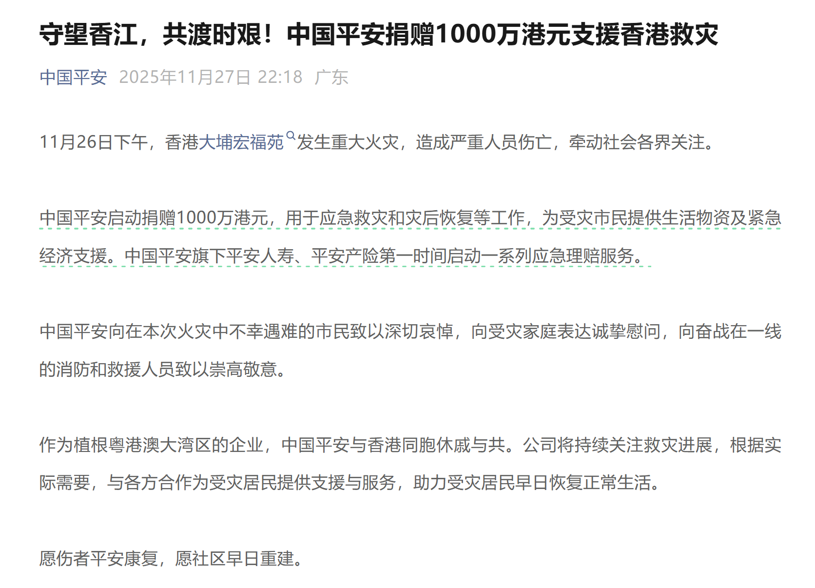 中国平安捐赠1000万港元,支援香港应急救灾和灾后恢复等工作