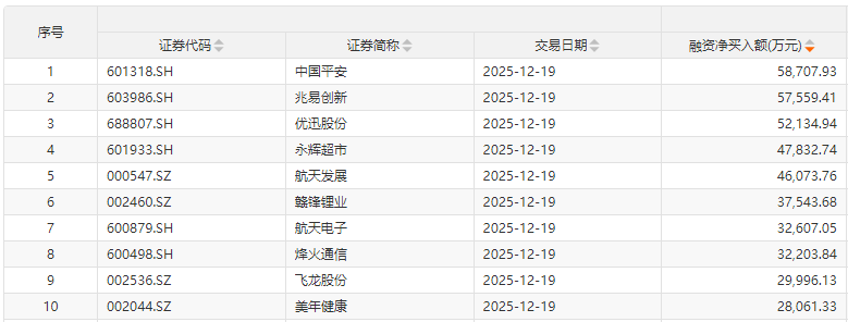 个股方面,22只个股获融资净买入额超1亿元。中国平安获融资净买入额居首,净买入5.87亿元;融资净买入金额居前的还有兆易创新、优迅股份、永辉超市、航天发展、赣锋锂业、航天电子、烽火通信、飞龙股份、美年健康。