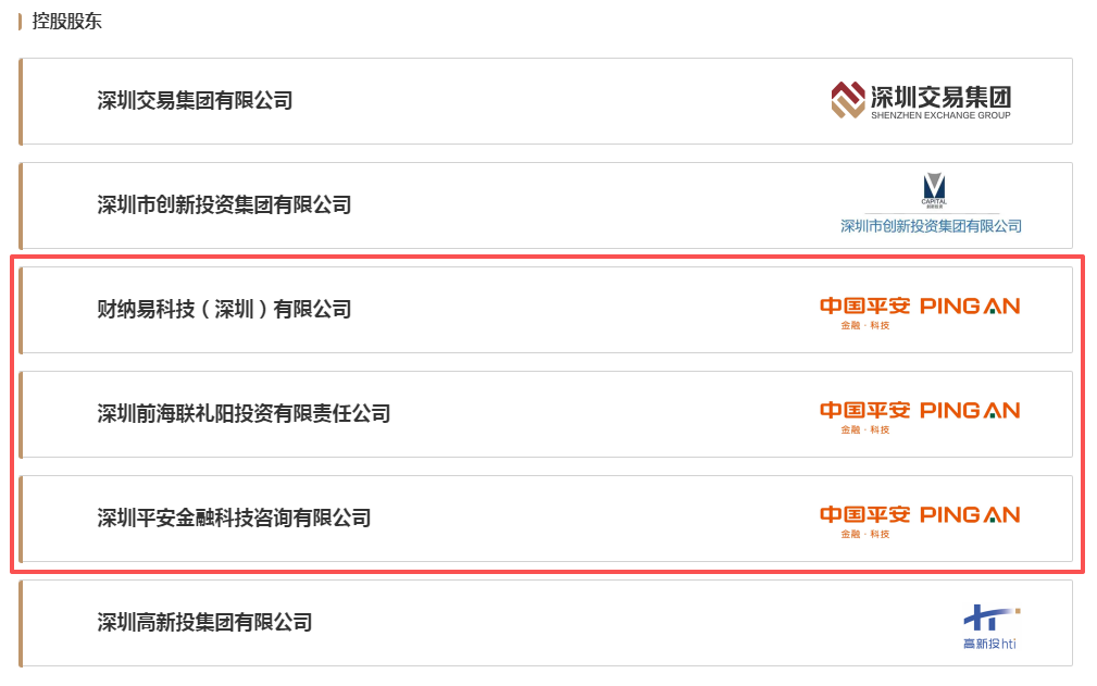 深圳联交所官网在披露公司的“控股股东”栏目下,将财纳易科技(深圳)有限公司、深圳前海联礼阳投资有限责任公司、深圳平安金融科技咨询有限公司三位股东均标明了“中国平安”的标识。