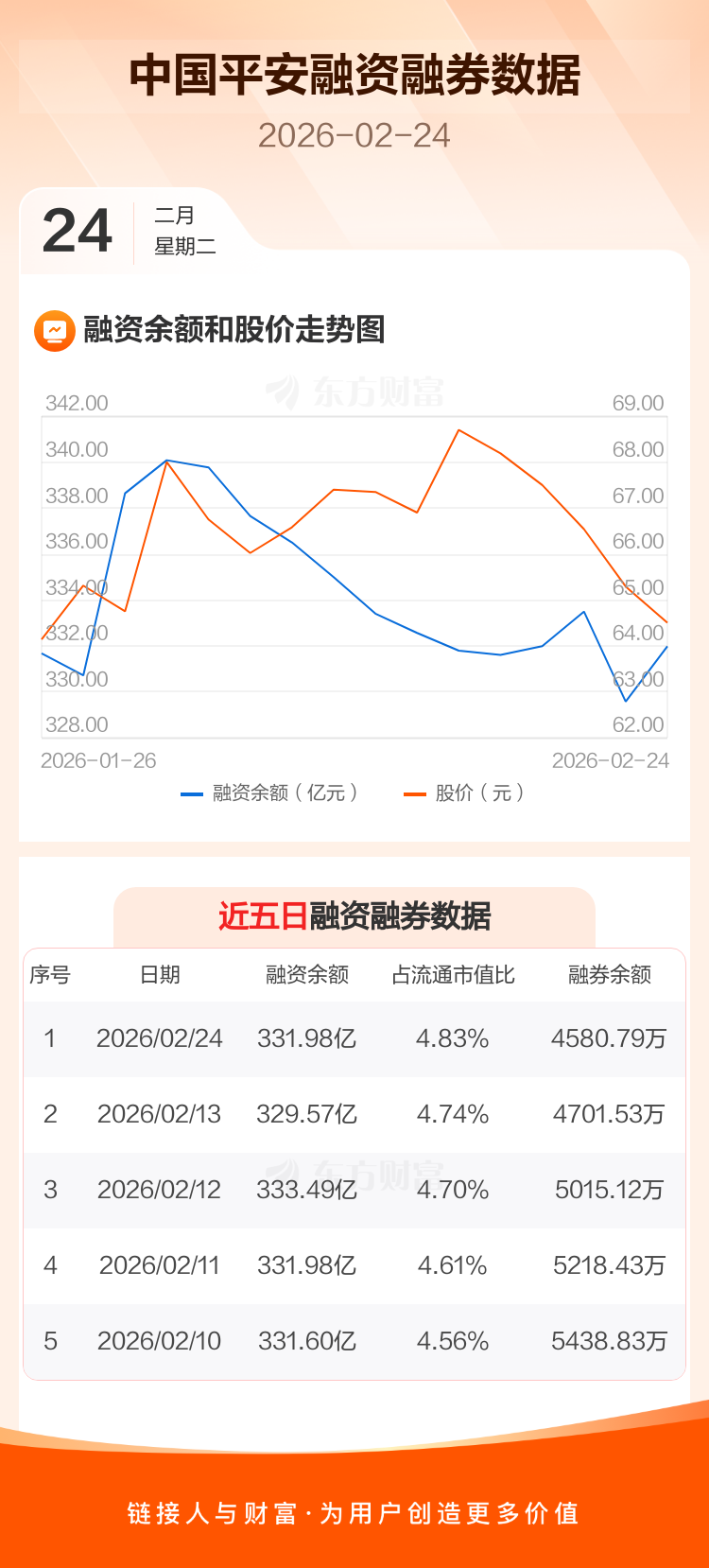 交易所最新数据显示,中国平安于2026年2月24日获融资买入5.68亿元,融资偿还3.27亿元,当日融资净买入2.41亿元。目前,该股融资余额331.98亿,占流通市值比例为4.83%。