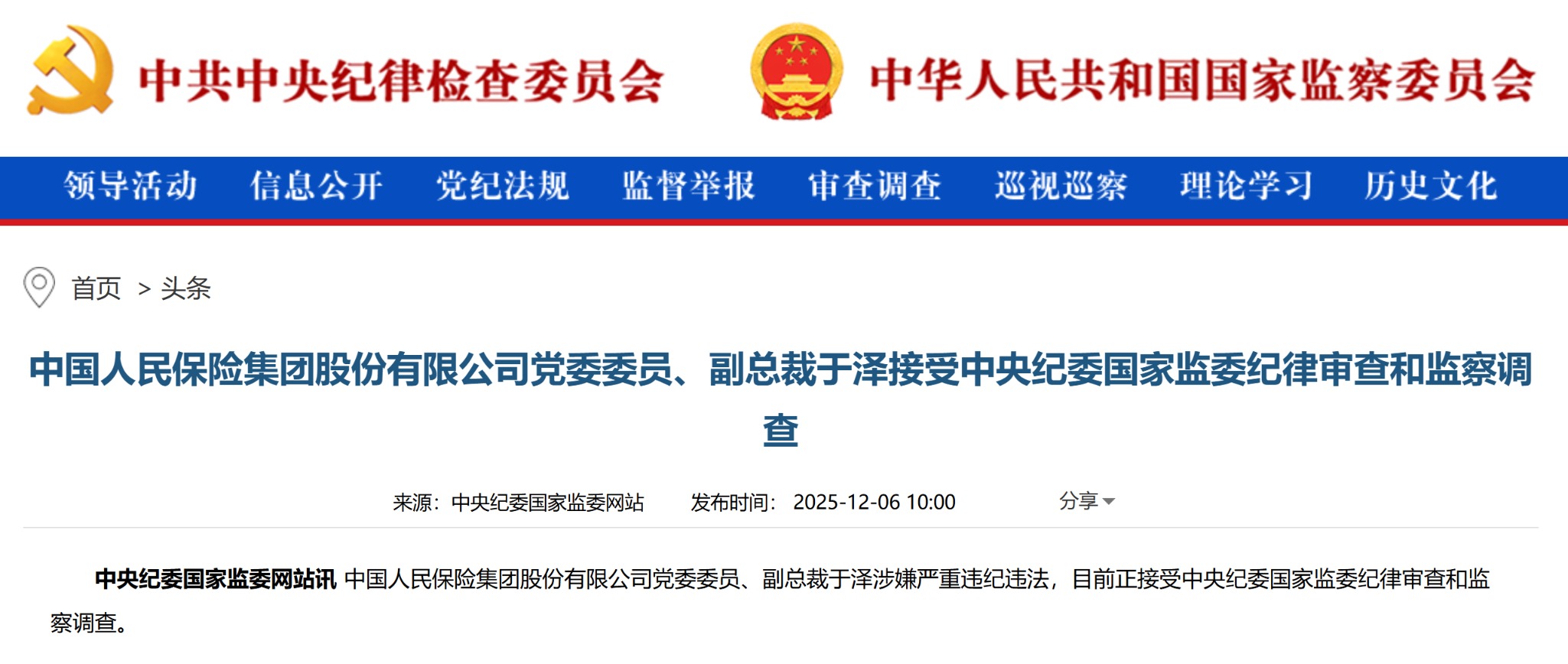 中央纪委国家监委网站12月6日消息,中国人民保险集团股份有限公司党委委员、副总裁于泽涉嫌严重违纪违法,目前正接受中央纪委国家监委纪律审查和监察调查。