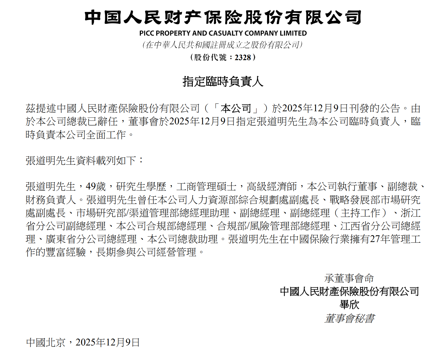 12月9日晚间,中国人民财产保险股份有限公司(下称“人保财险”)发布公告称,于泽因个人原因停止履职,辞任公司执行董事、副董事长、总裁、董事会战略规划委员会/可持续发展委员会委员、董事会风险管理与消费者权益保护委员会(资产负债管理与投资决策委员会)主任委员及其他所有相关职务。