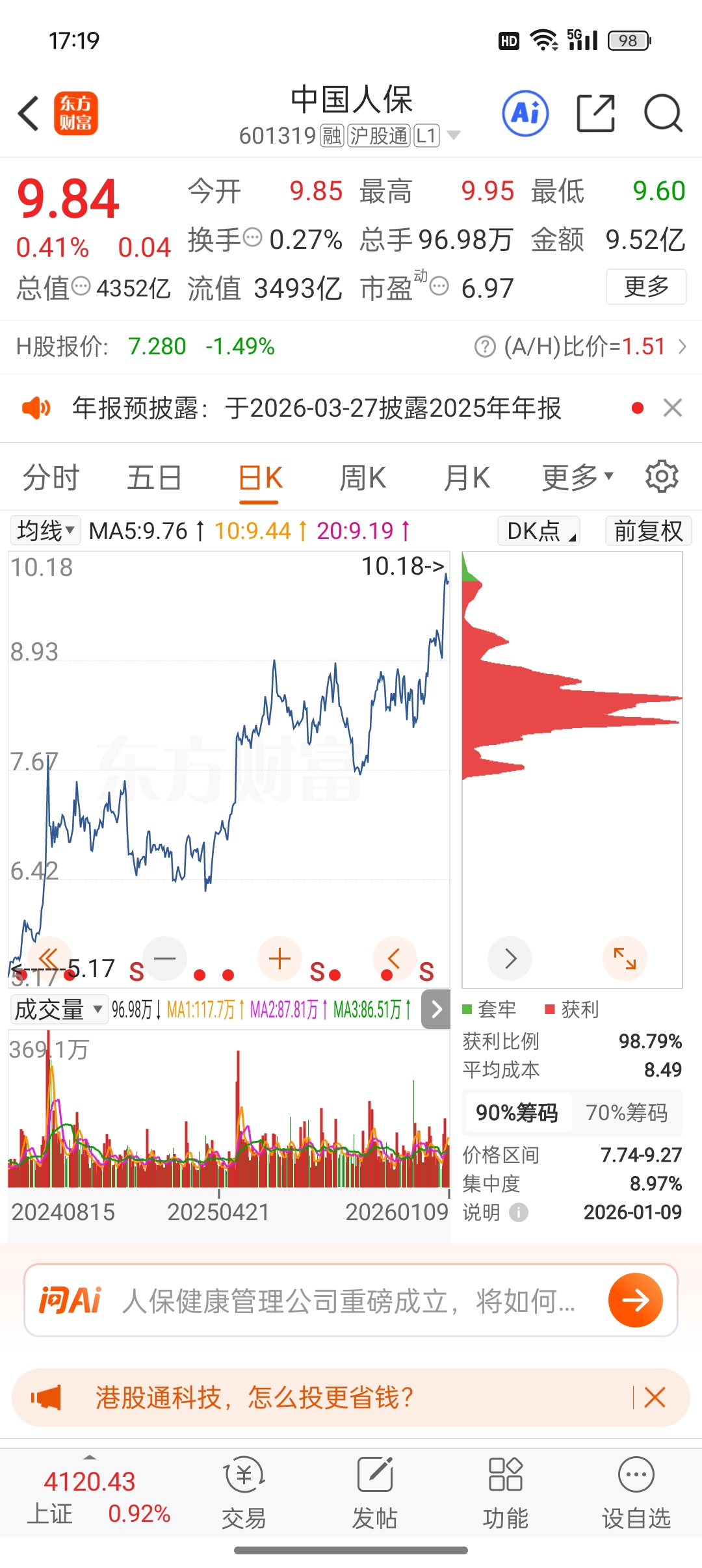 $中国人保(SH601319)$ 请教高手,为什么日k和周k筹码峰不一样?