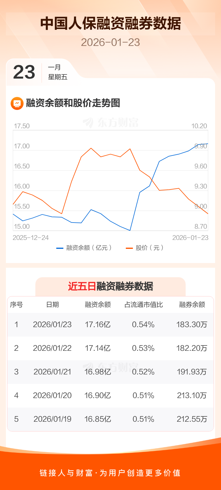 交易所最新数据显示,中国人保于2026年1月23日获融资买入6610.00万元,融资偿还6381.38万元,当日融资净买入228.62万元。目前,该股融资余额17.16亿,占流通市值比例为0.54%。