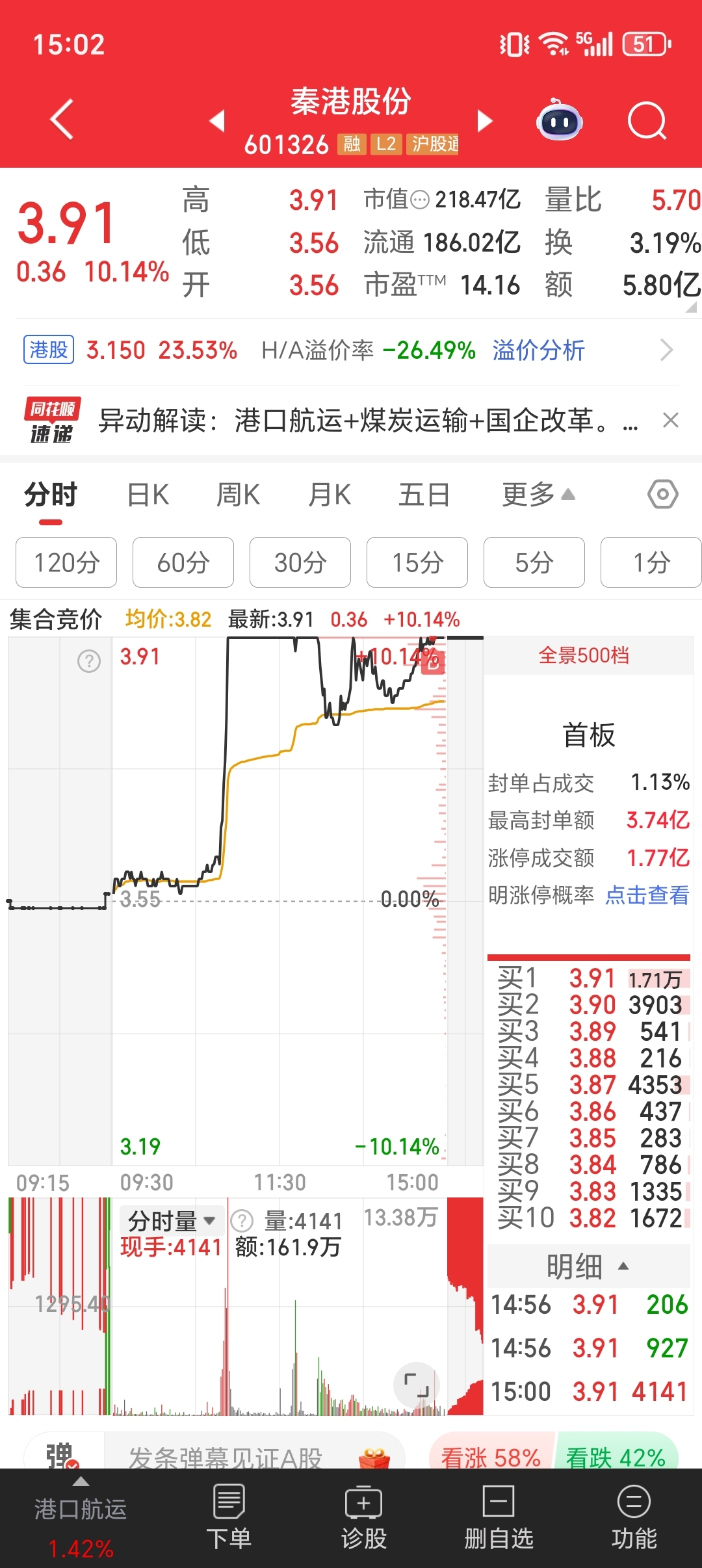 $秦港股份(SH601326)$ 我出了血力好吧,
