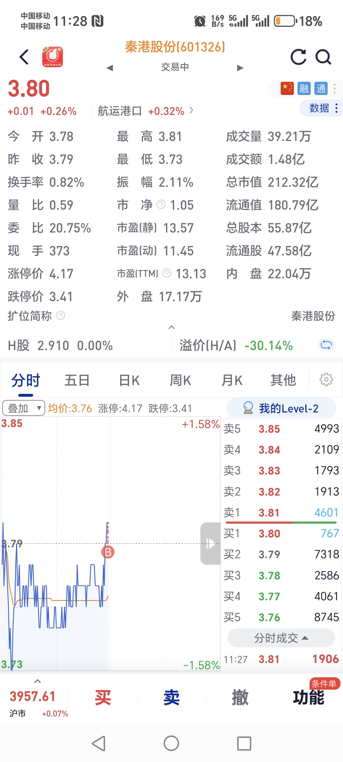 $秦港股份(SH601326)$ 3.81干了,你们接力!!!