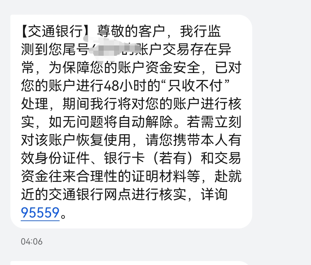 $交通银行(SH601328)$ 前几天上夜班,朋友凌晨3点多的时候给俺转了几百块钱,第二天一看,卡被风控了,只进不出。
