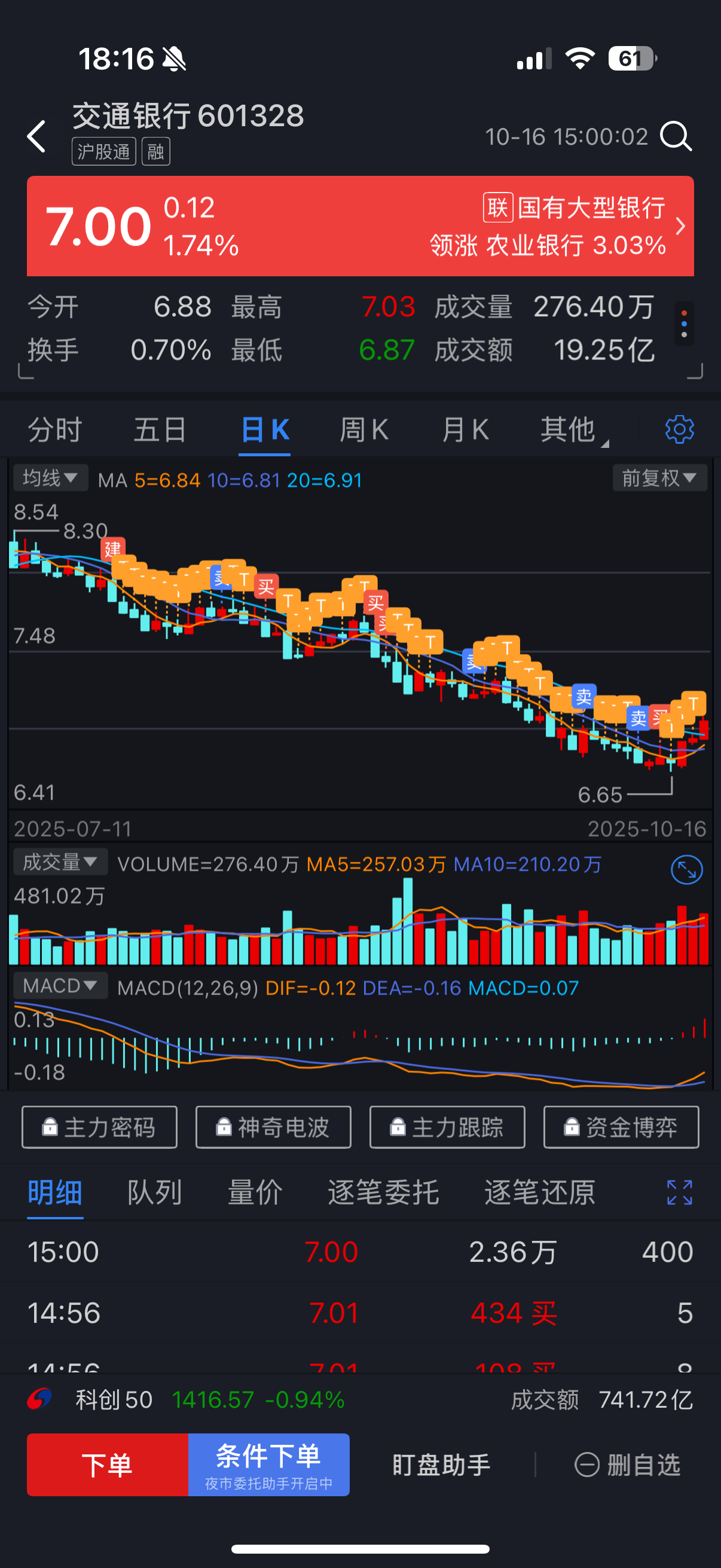 这是本人第二次在交行被坑,上次是2020年1月5.5元买,被砸到4.5元。。上次也跟这次一样,5.35元大减后持有少量打酱油,之后4.5元补仓。。上次交行在4.5元停留一年,这次不知道会在7元停留多久,可以肯定交行7元附近是底,跌不下去。。跌不下去的原因,2020年4.5元是套牢中证金(中证金是2015年护盘接的)。。这次7元跌不下去的原因,是财政部今年6月8.53元增发1200股套牢。