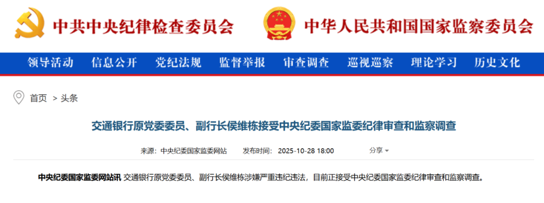 10月28日,中央纪委国家监委官网通报:交通银行原党委委员、副行长侯维栋涉嫌严重违纪违法,目前正接受中央纪委国家监委纪律审查和监察调查。