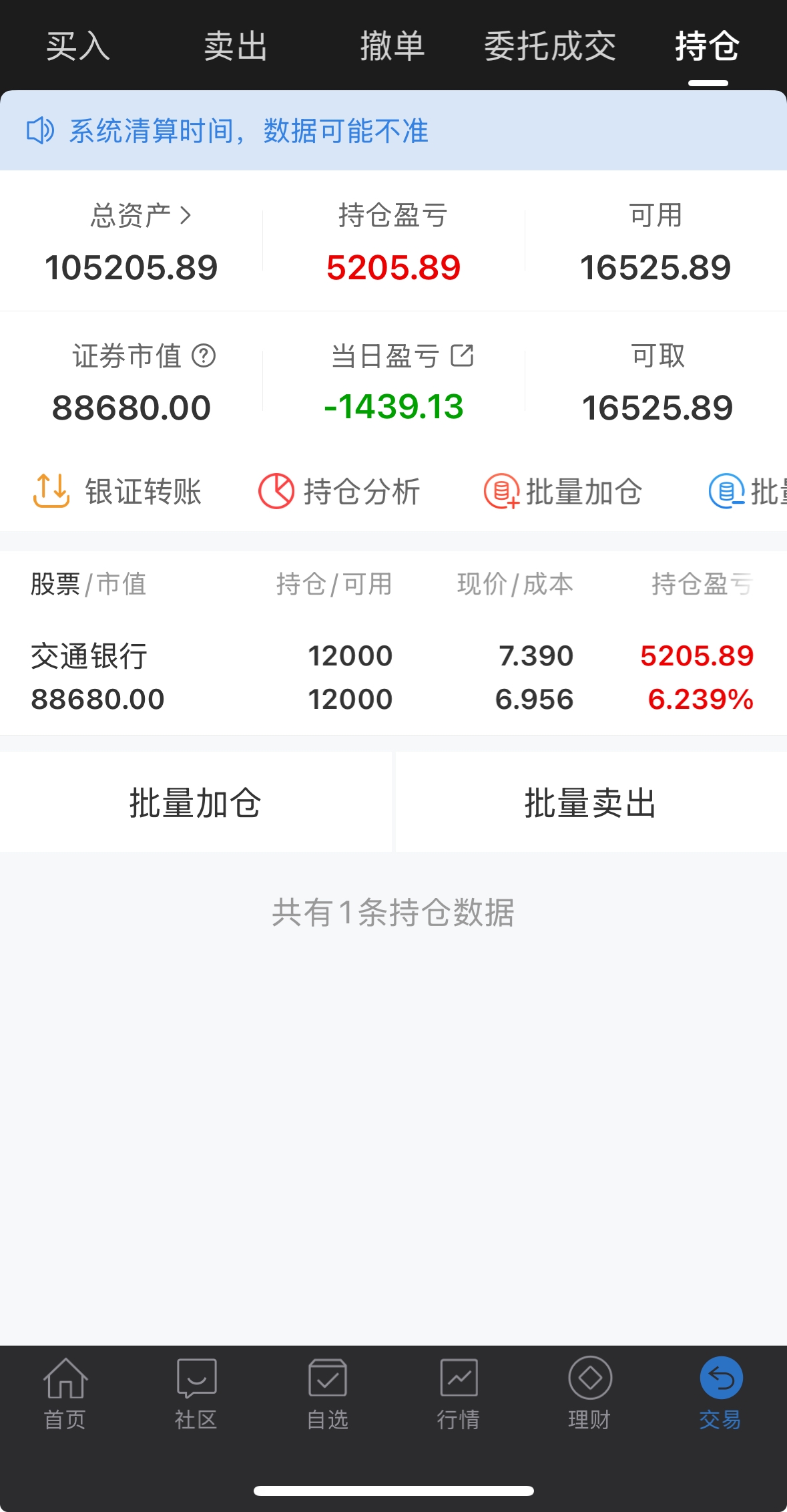 $交通银行(SH601328)$ 知行合一,知易行难,发了点奖金,今天7.45加仓了1800股,目前共持有12000股,均价6.95,每月定投1500元保持不变(择机买入)