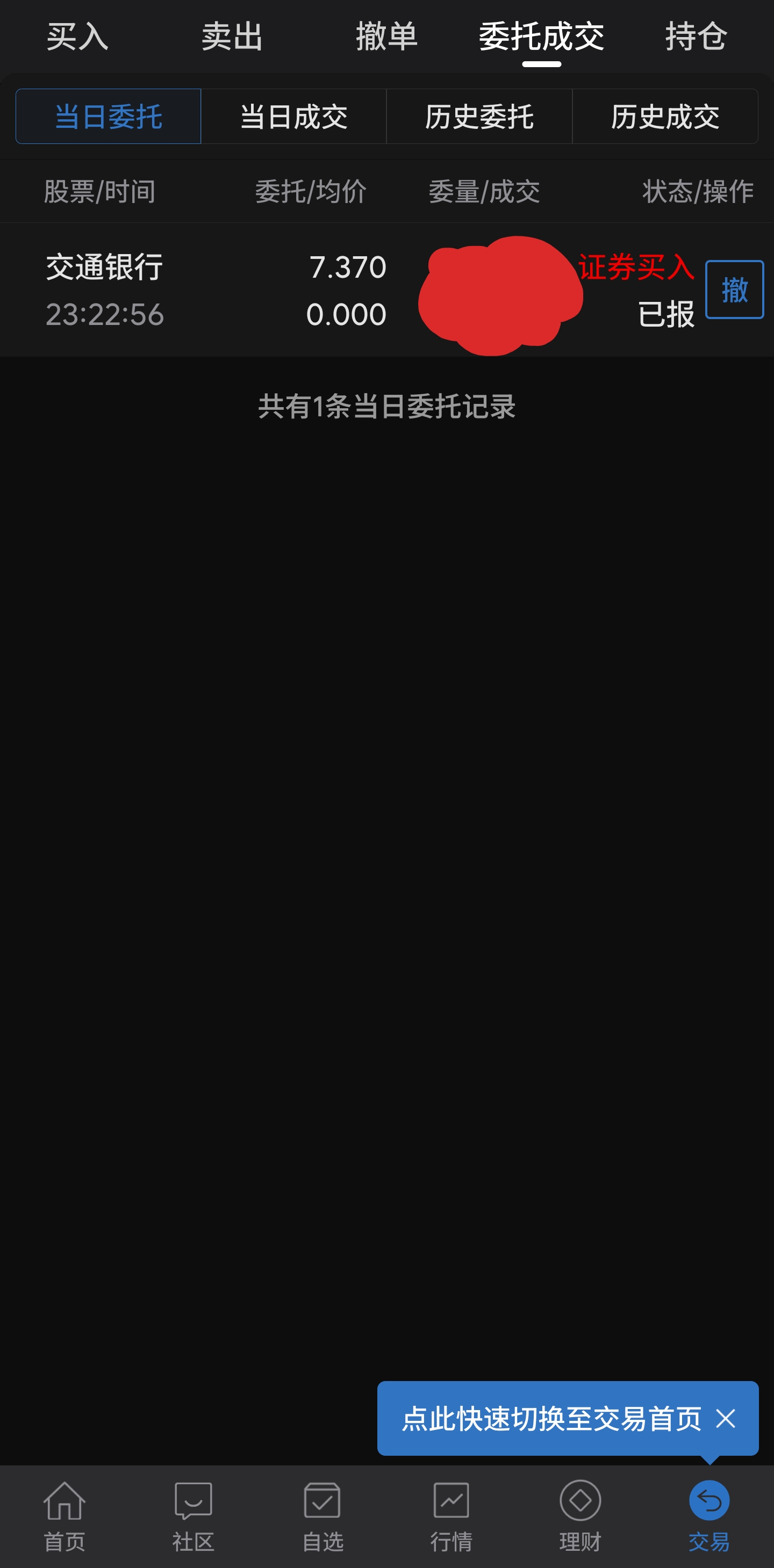 $交通银行(SH601328)$ 为什么我的委托没有成交