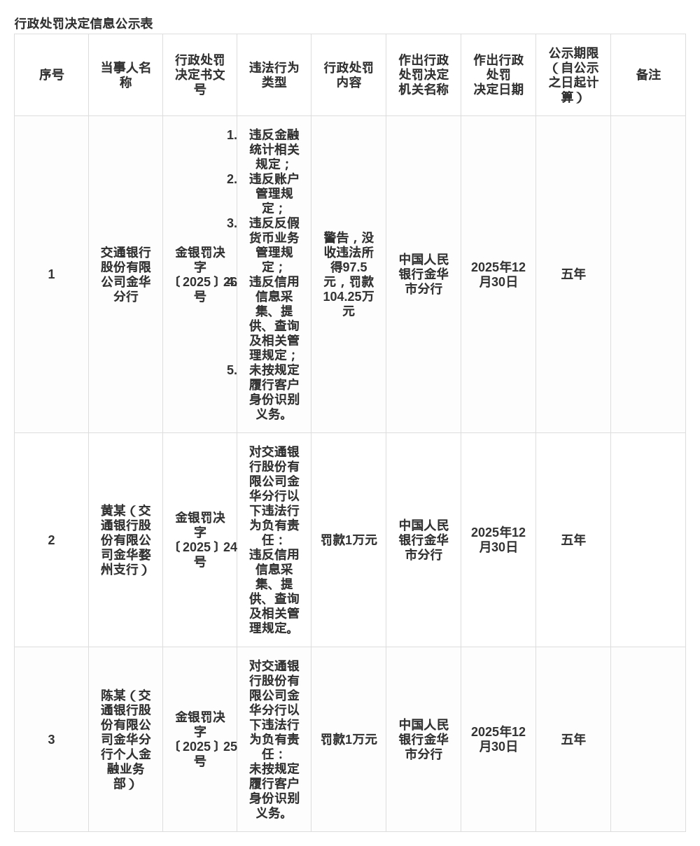 交通银行金华分行被罚104.25万,涉多项金融违规