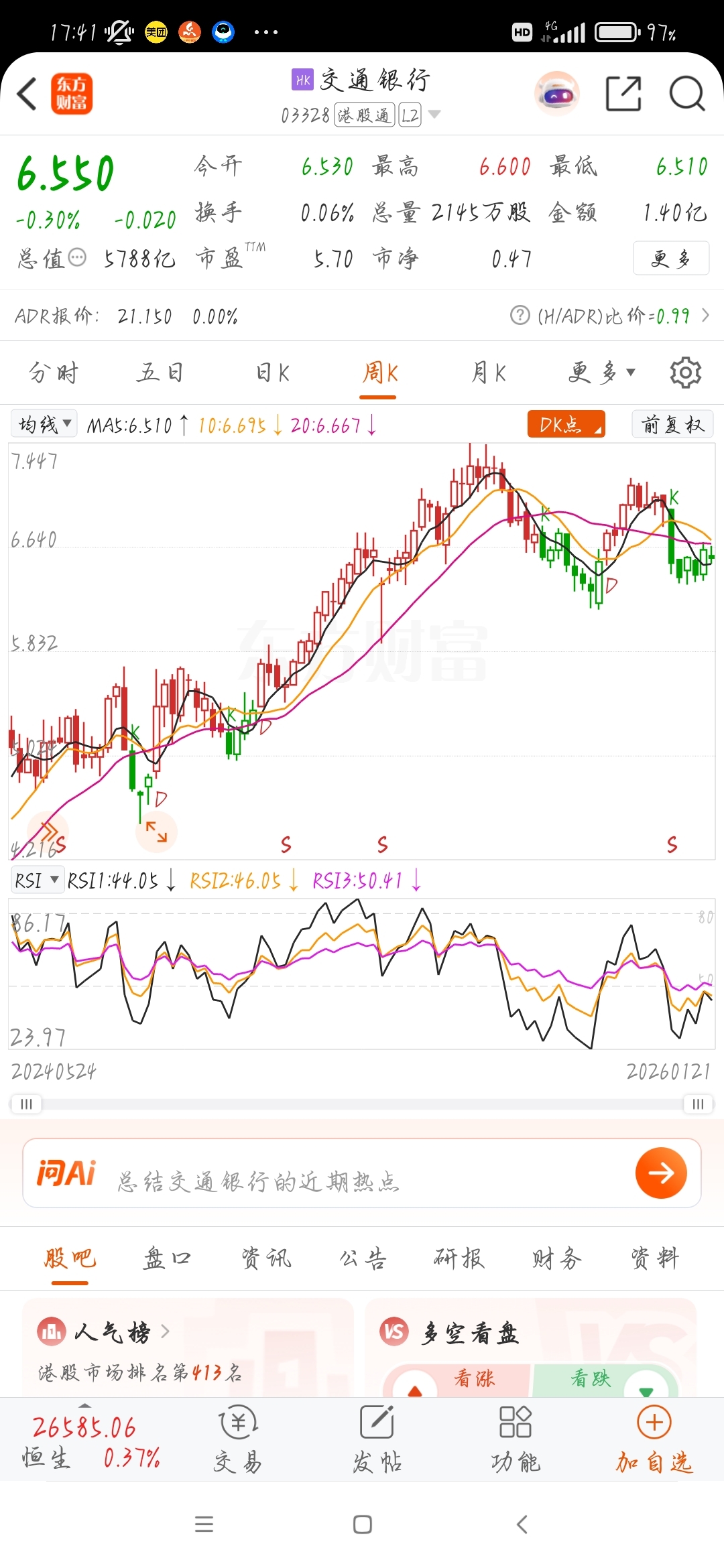 $交通银行(SH601328)$ 放一张港股的,周线图,体会一下,继续跌,还是……。