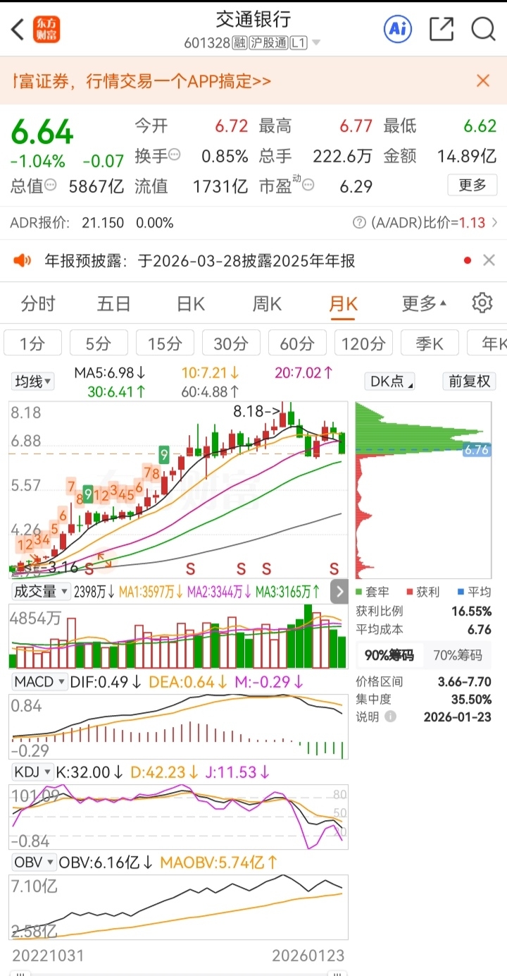 $交通银行(SH601328)$ 持续下跌最长时间的是交通银行,下跌持续时间已经7个月了(210天),跌幅最高的也超过了25%。下一站是6.49元,在车上现在真的好痛苦,而且是重仓,继续下跌趋势未改且遥遥无期,躺平了,坐等拿股息,红利再投,小资金慢慢买入就好!
