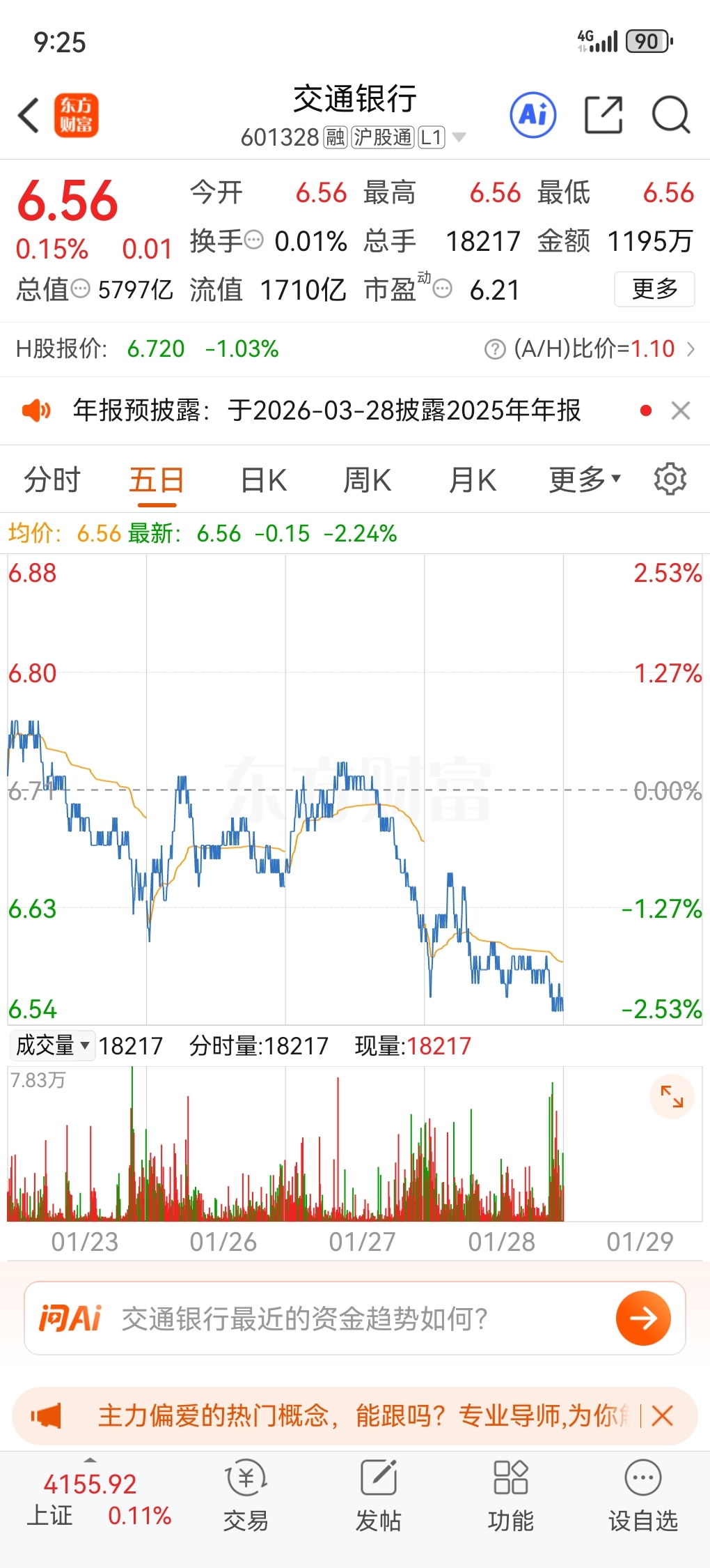 $交通银行(SH601328)$ 呵呵,继续高开低走,下午你一定绿