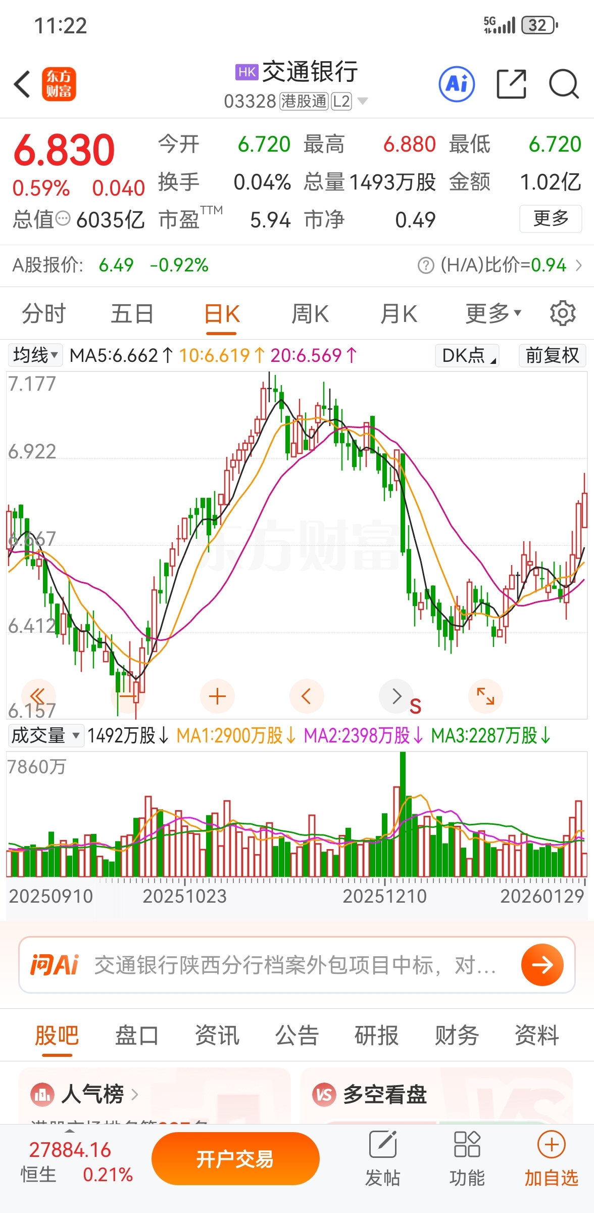 $交通银行(SH601328)$ 应该没有问题,港股不断上升。迟早会大升