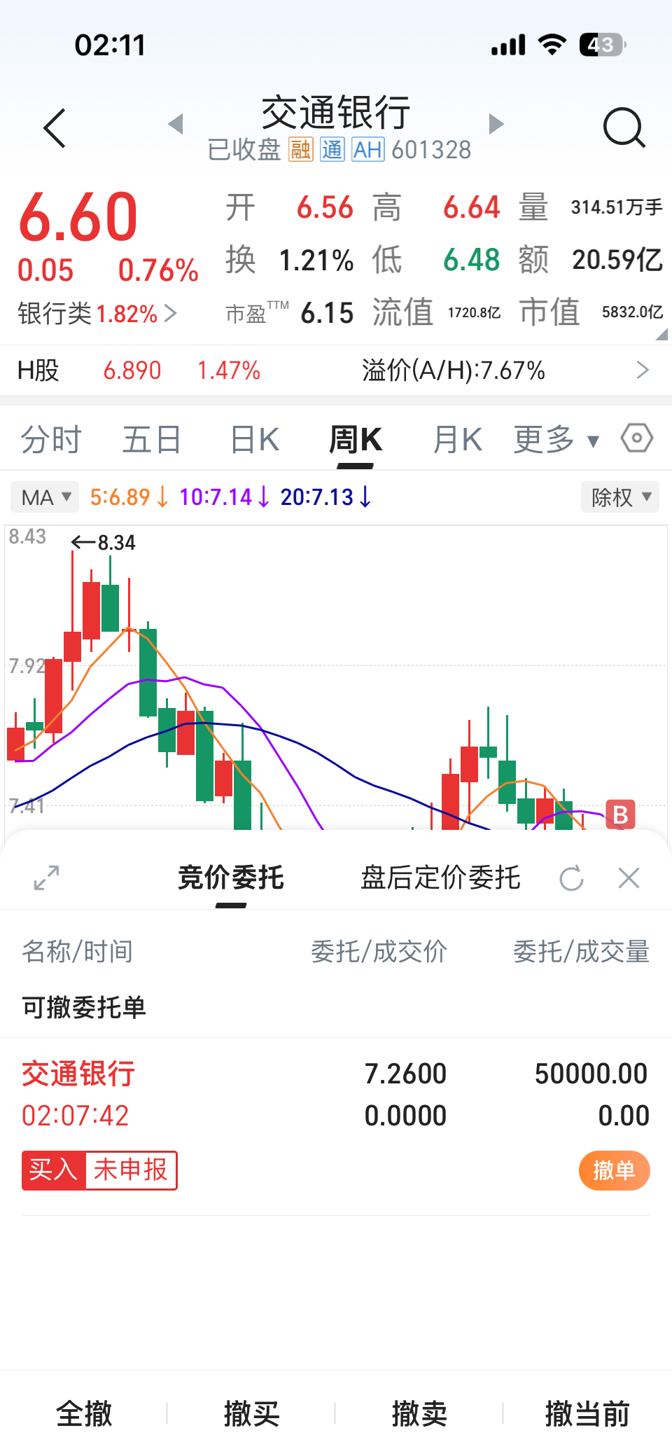 $交通银行(SH601328)$ 朋友们,银行股已经开始触底反弹了,今天最后一次扫货交通银行,还是那句话,没个几十上百万的资金别玩银行股。