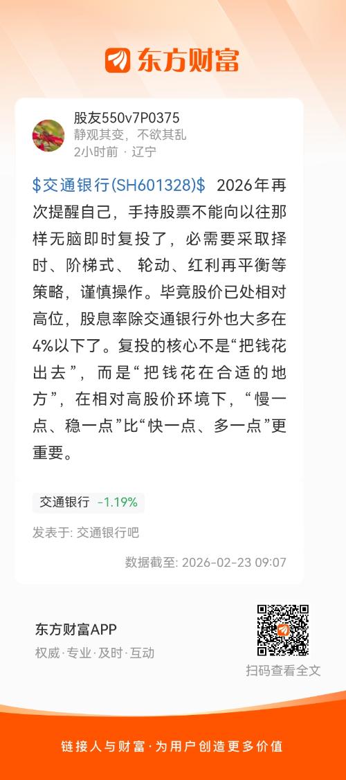 $交通银行(SH601328)$ 2026年再次提醒自己,手持股票不能向以往那样无脑即时复投了,必需要采取择时、阶梯式、 轮动、红利再平衡等策略,谨慎操作。毕竟股价已处相对高位,股息率除交通银行外也大多在4%以下了。复投的核心不是“把钱花出去”,而是“把钱花在合适的地方”,在相对高股价环境下,“慢一点、稳一点”比“快一点、多一点”更重要。