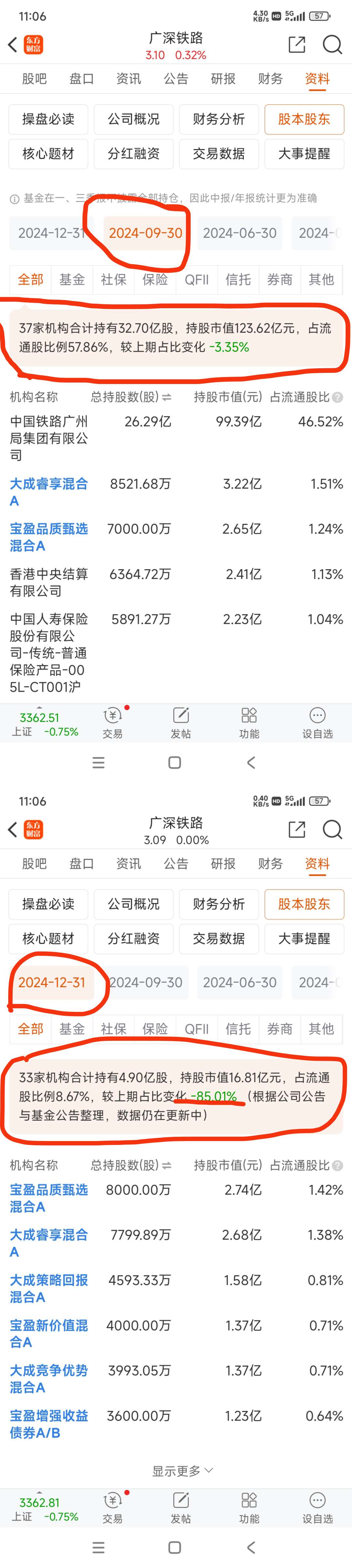 $广深铁路(SH601333)$ 这就是下跌的根本原因,机构已经抛弃了这个啦叽鼓,持有的市值从123.6亿元到16.8亿。这不是吸筹,这是在抛这个啦叽鼓。