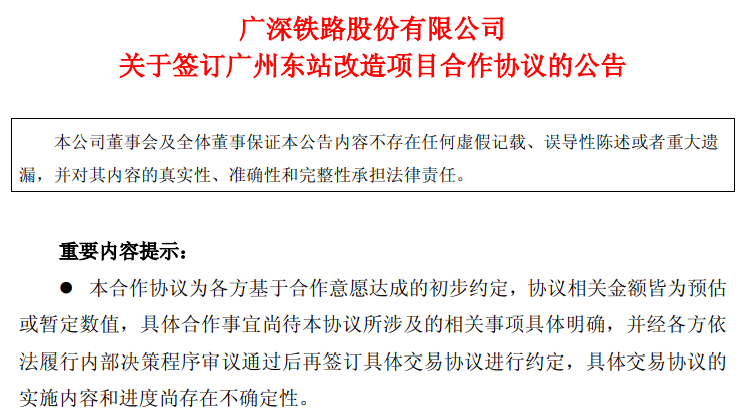 7月25日晚,广深铁路发布公告称,于2025年7月25日与广州市政府、中国铁路广州局集团有限公司(以下简称广铁集团)就广州东站改造工程签订了合作协议。