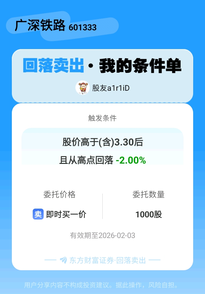 #条件单交流# #回落卖出晒单# 一位股神设置了一个回落卖出条件单,接下来就是见证奇迹的时刻~$广深铁路(SH601333)$