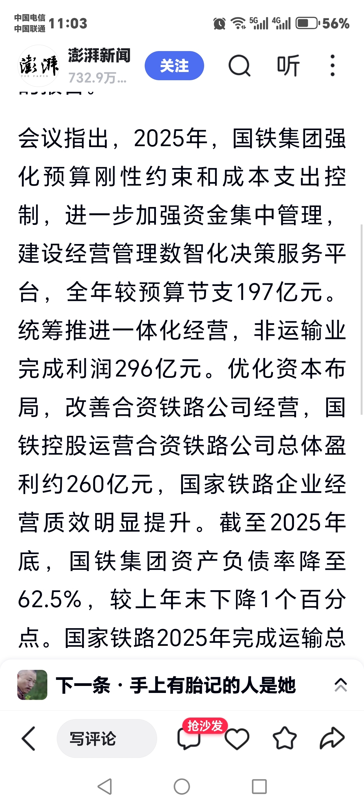 $广深铁路(SH601333)$ 过去的2025年,国铁集团非运输业完成利润296亿元,国铁旗下控股运营合资铁路公司实现盈利260亿元。大伙终于开始意识到:原来