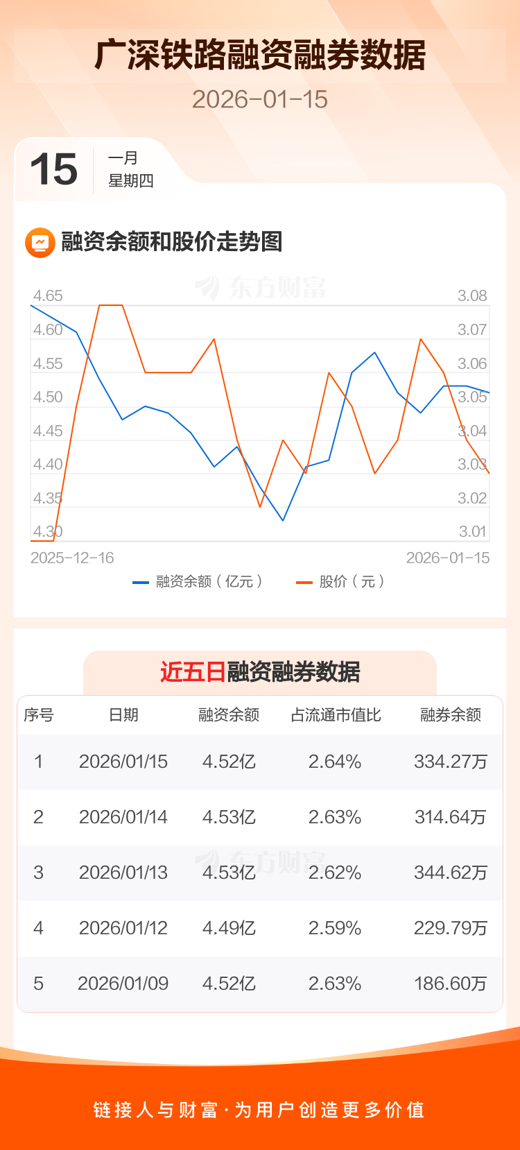 交易所最新数据显示,广深铁路于2026年1月15日获融资买入1094.91万元,融资偿还1151.38万元,当日融资净偿还56.47万元。目前,该股融资余额4.52亿,占流通市值比例为2.64%。